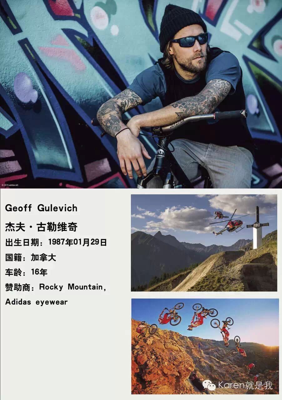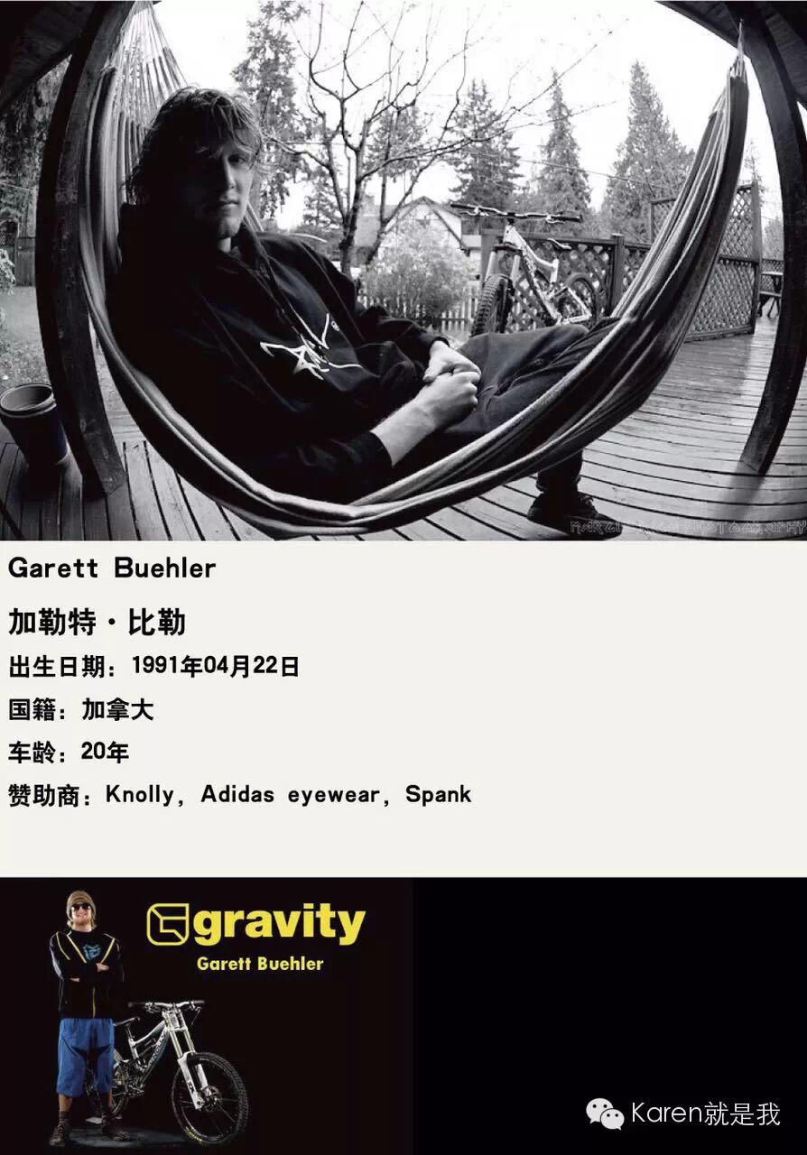 Knolly,Adidas eyewear,Spank赞助选手,2008年2011年和2013年都曾经参加红牛坠山赛,除了各种顶级赛事,Garett还走遍世界的拍摄单车电影,曾经的一部《where the trails end》(车轮不息),横扫全球,备受中国车友追捧!这次,Garett亲临中国,又将给我们带来什么惊喜呢?