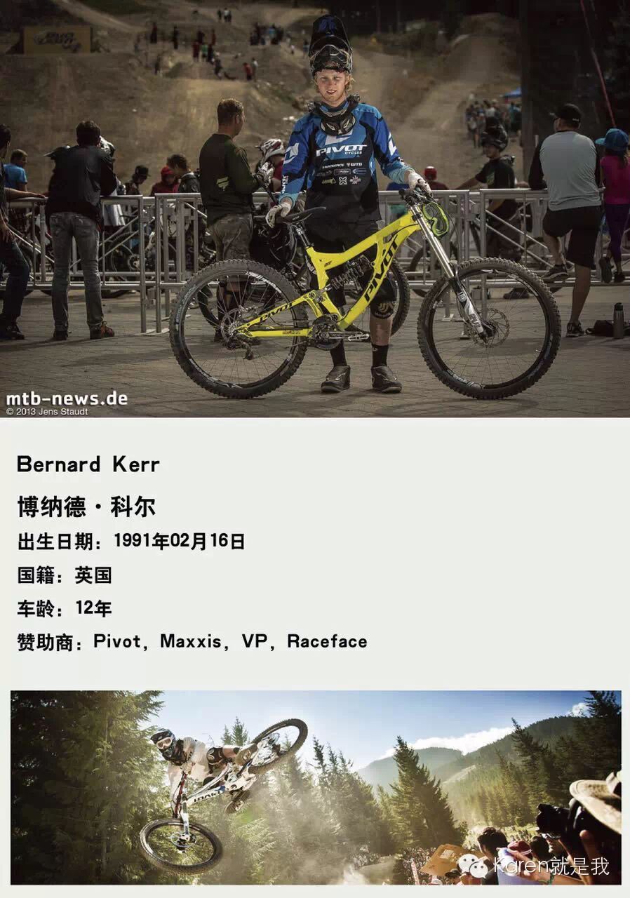 英国山地车速降新秀,Pivot,Maxxis,VP,Raceface赞助选手。2013年他的世界杯最好成绩22,勤奋刻苦的bernard整个冬天都在新西兰集训,2014年开始,成绩突飞猛进,到2015年更是一发不可收拾,前几天在法国的世界杯,预赛排名第六,最终决赛摔车,遗憾与前十失之交臂。2015赛季还在新西兰crankworx比赛中speed&style第三名,whipoff第二名!