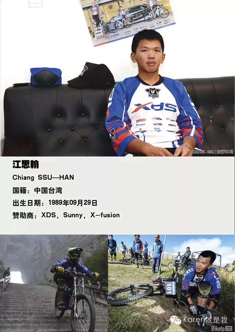 中国台湾,大陆车友对他一定不会陌生,大家都亲切的叫他“小熊”,台湾喜德盛小熊车队,喜德盛,森利赞助选手。2012-2013年几乎包揽了大陆所有山地车速降比赛的冠军。