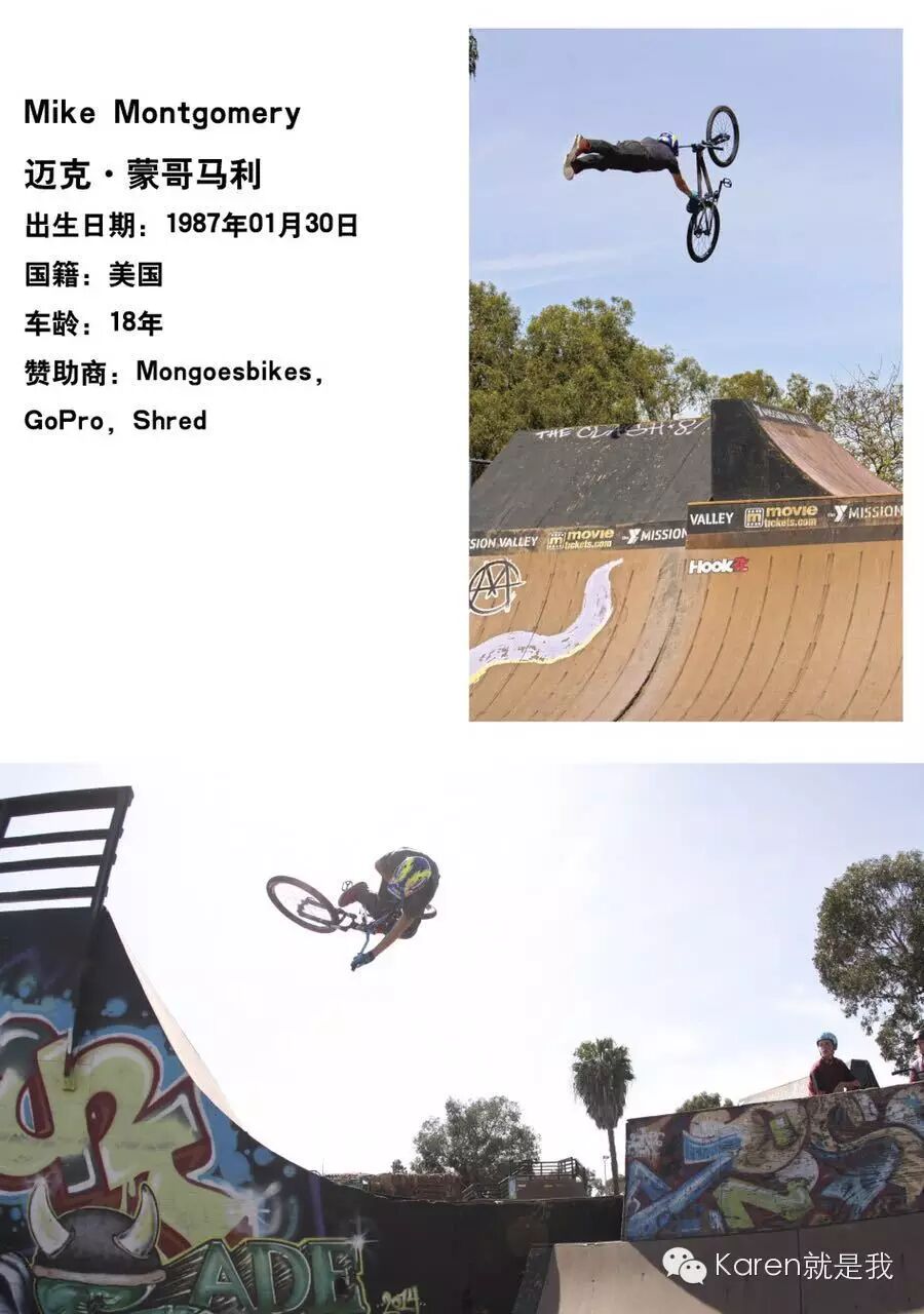 Gopro,Shred,Mongooes赞助下选手。说到Mongooes,中国车友一定不会陌生,就是中国小轮车泥地竞速国家队赞助品牌。BMX小轮车转型为山地车技巧车手,Mike坦言,小轮车功底给了他不少帮助,喜欢追求创新,不拘一格是他不断赢得比赛的秘笈。2010年Crankworx 技巧赛第二名,2013年红牛坠山赛第十二名。